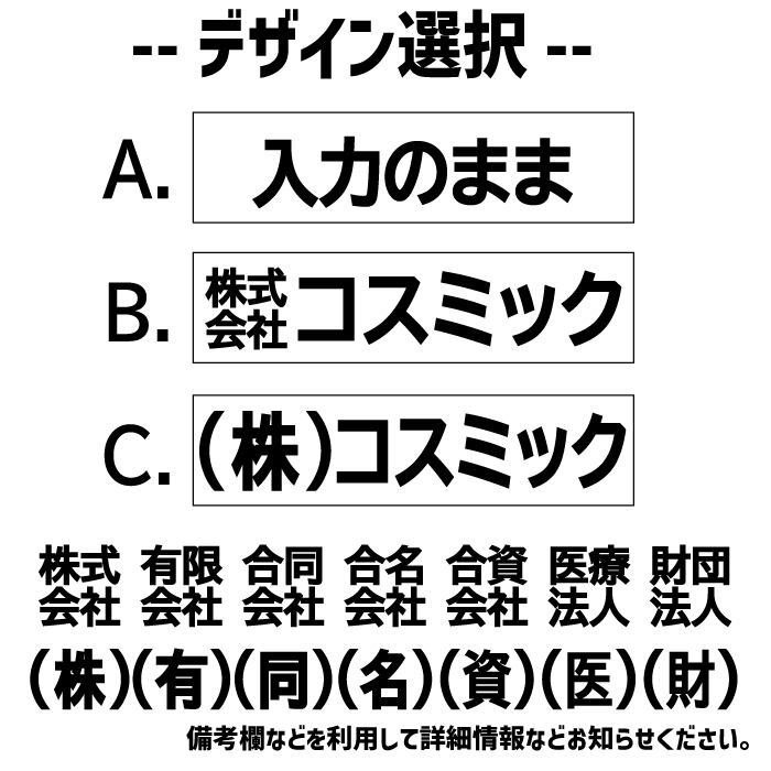 サイズ→デザイン→書体→文字色カラー を選択の上、 表示面内容(会社名)を入力してください。